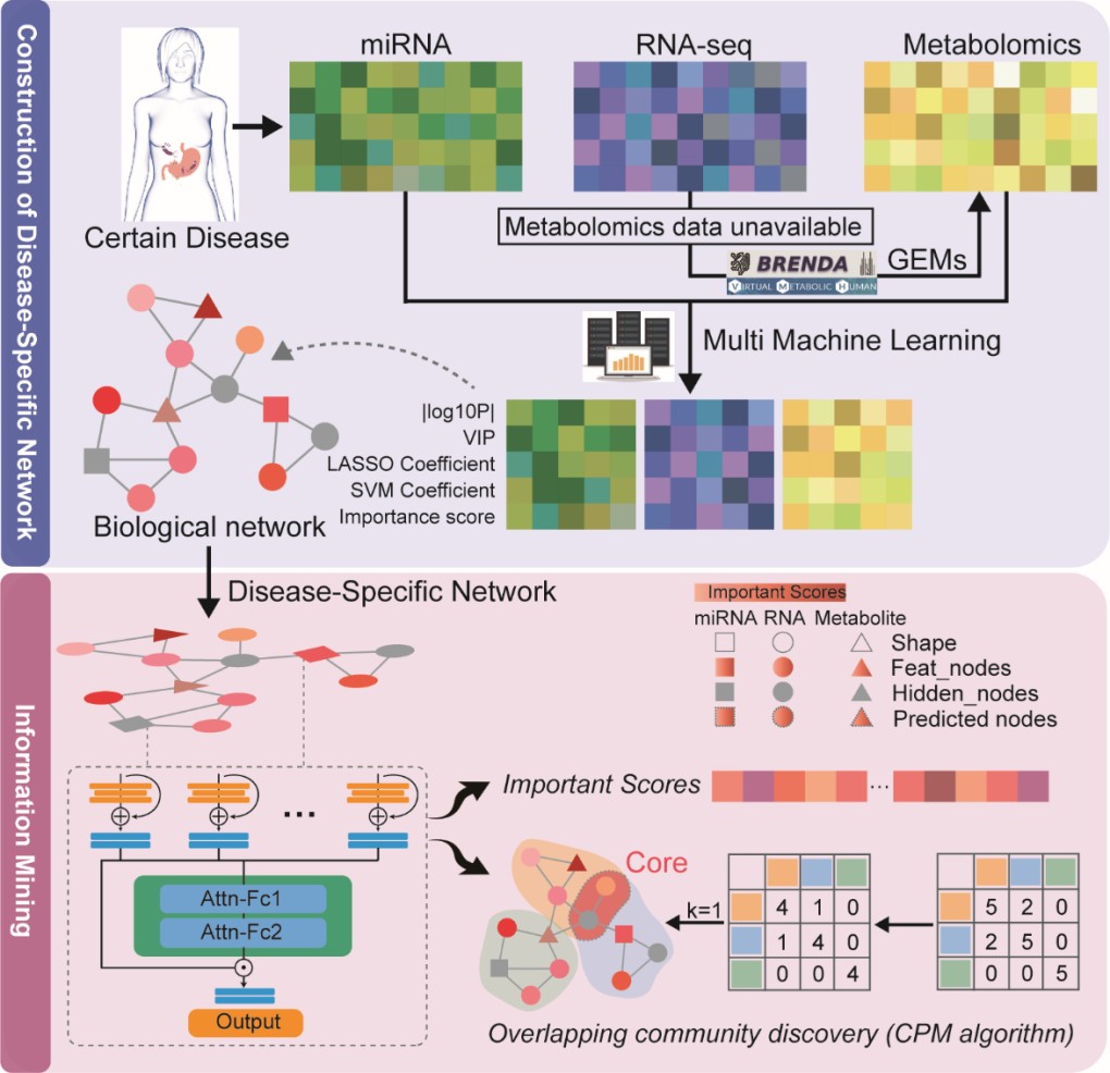 多组学整合是系统生物学研究的重要环节,由于数据异质性、高维度及噪声干扰等问题,目前在捕捉非线性生物学关系、识别关键通路方面存在局限。本研究提出了MODA多组学数据整合框架,以先验知识图谱为基础,结合图卷积网络与注意力机制,融合多机器学习模型生成的分子重要性评分,精准识别关键分子及相关功能模块。